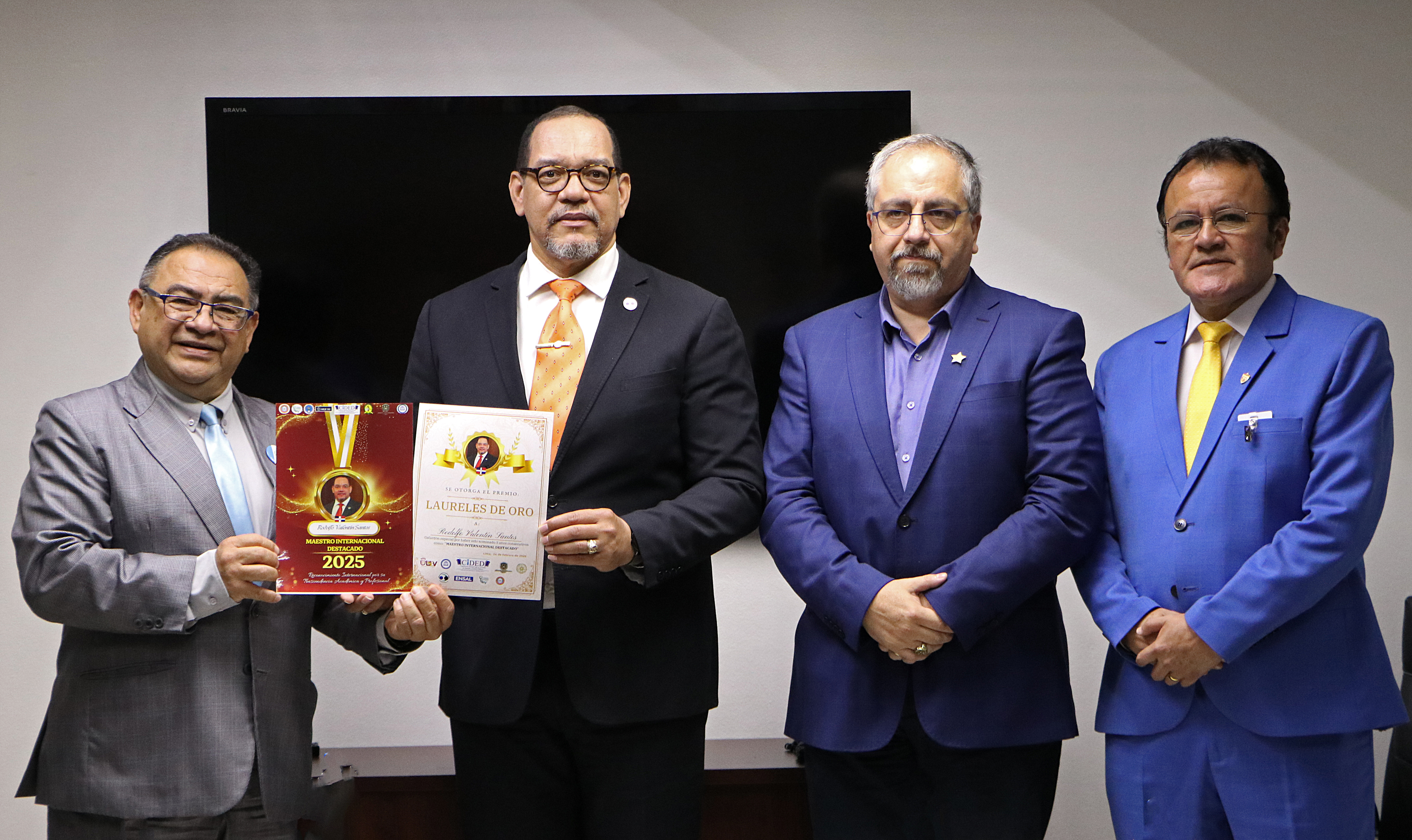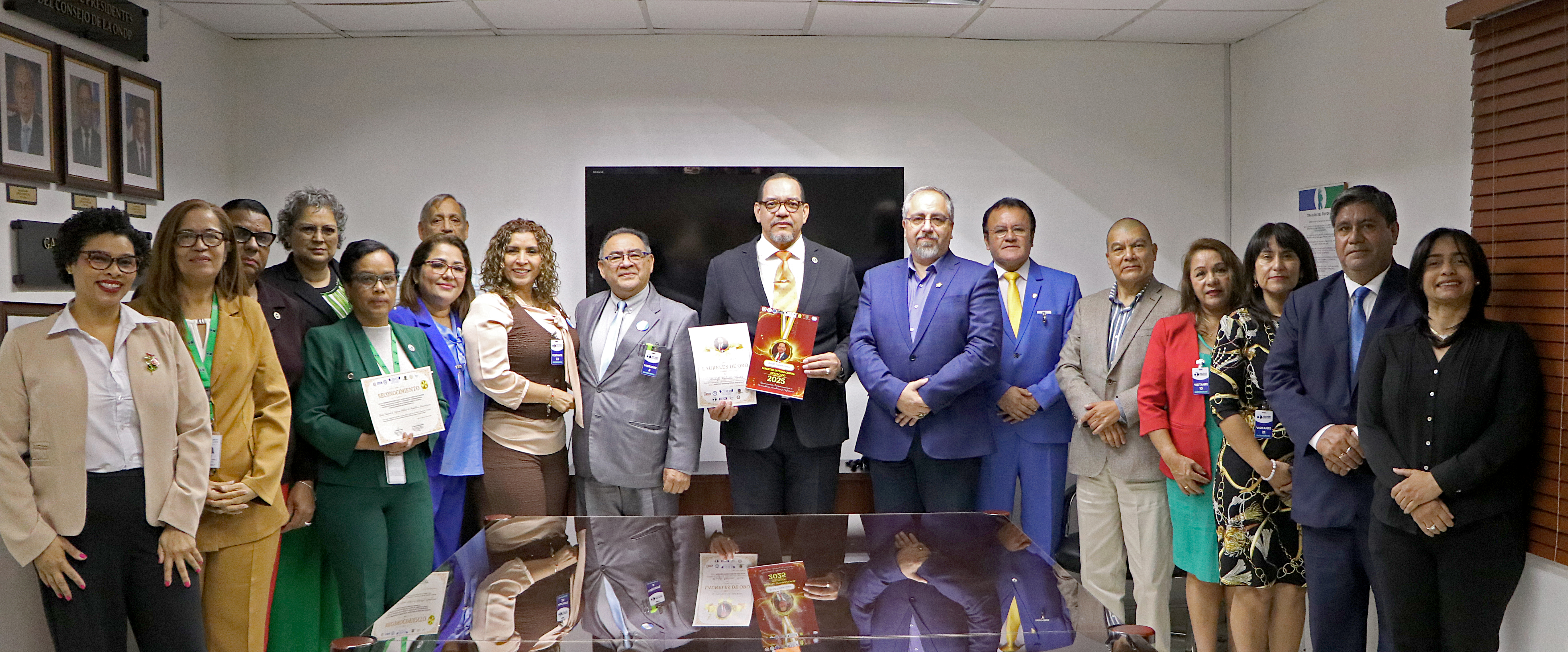 Durante el encuentro, el Director de la ONDP, Lic. Rodolfo Valentín Santos, fue distinguido con tres importantes reconocimientos internacionales que destacan su liderazgo, trayectoria académica y contribución al fortalecimiento de la justicia en la República Dominicana.
