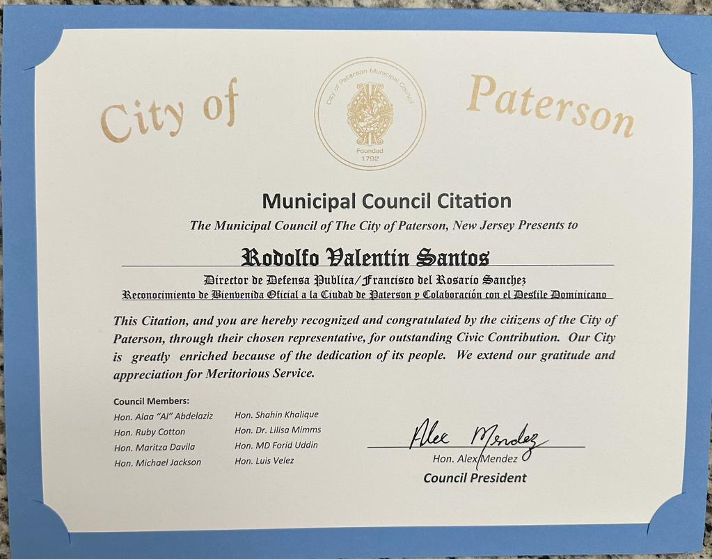Paterson, New Jersey, [Fecha] - En un emocionante acto que contó con la presencia del Alcalde de Paterson, distinguidos Cónsules Dominicanos en Estados Unidos, destacados empresarios e invitados especiales, el Consejo Municipal de Paterson se reunió para reconocer y honrar a dos figuras destacadas en el ámbito de la justicia y la comunidad dominicana.