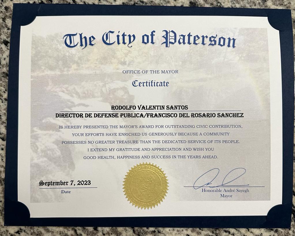El Presidente del Consejo Municipal de Paterson, Alex Méndez, encabezó la ceremonia y presentó un merecido reconocimiento al Licenciado Rodolfo Valentín Santos, Director de la Oficina Nacional de Defensa Pública. El Sr. Santos fue elogiado por su extraordinaria dedicación al servicio de las personas que necesitan una defensa digna y profesional. Además, se destacó su destacado trabajo en la elaboración del Informe de Detección y Prisiones 2022.